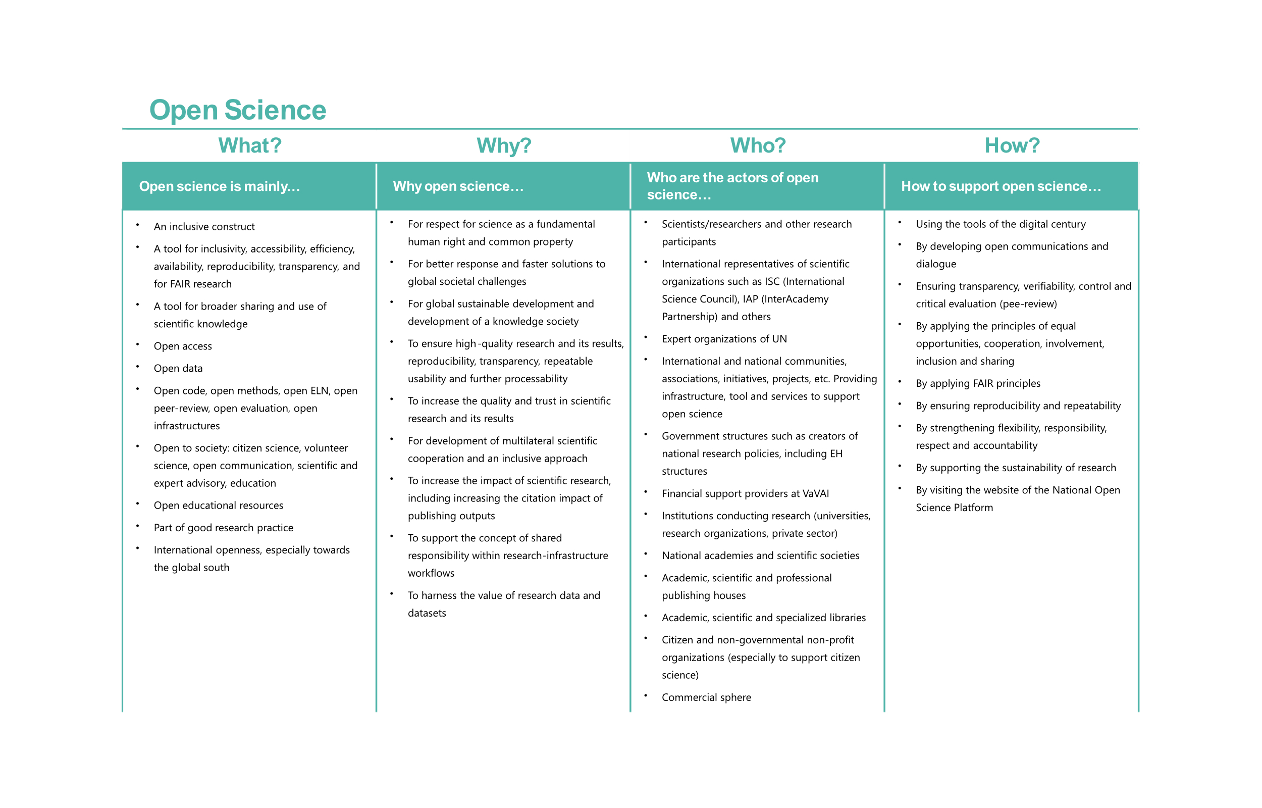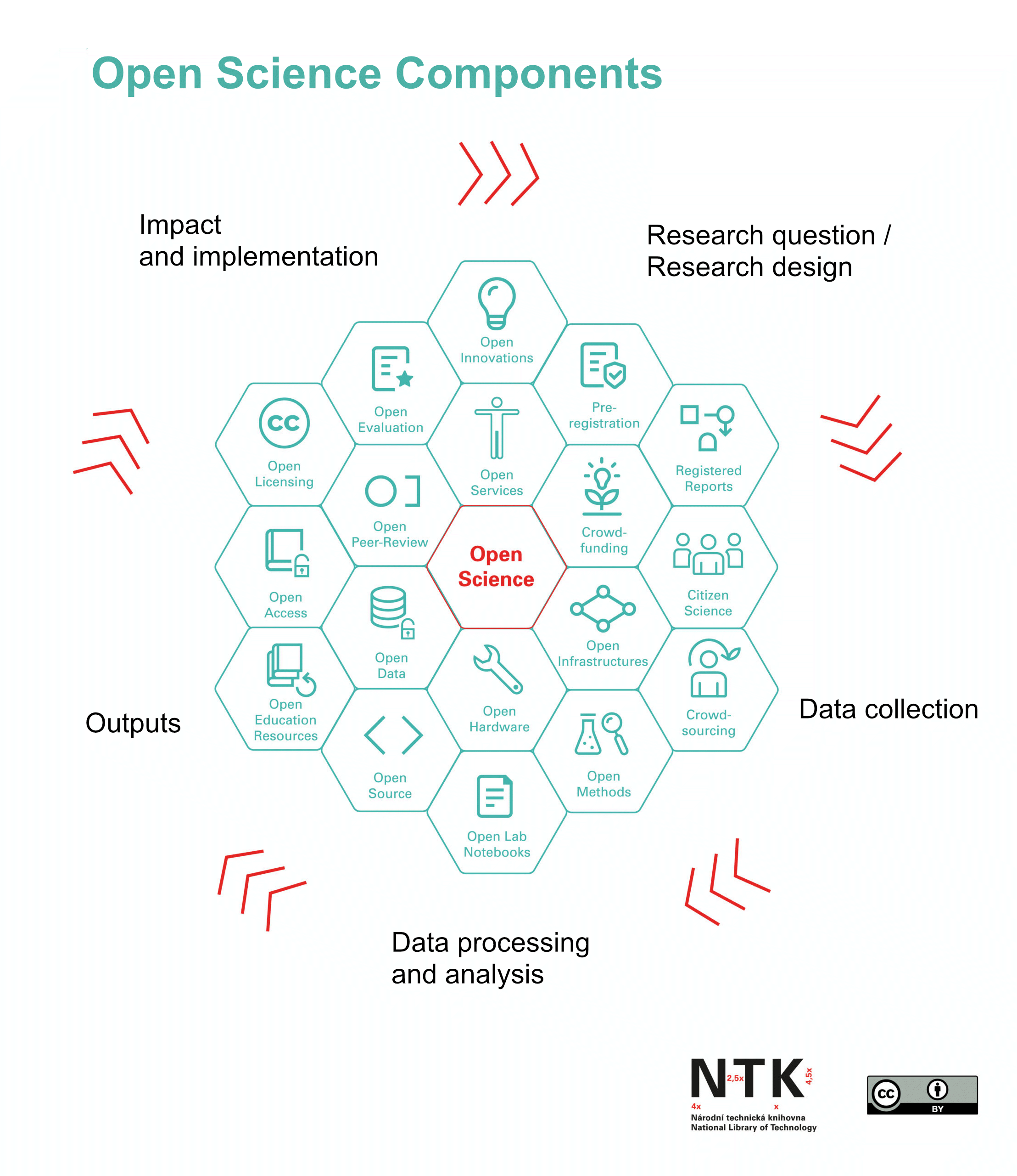 Open science encompasses the pillars of Open Access, Open Data, Open Source, Open Hardware, Open Evaluation, Open Notebook, Open Science Infrastructures, Open Labs, Open Educational Resources, Citizen Science, Crowdfunding, and Open Innovation. Below, we list those that are key from the perspective of the BC.